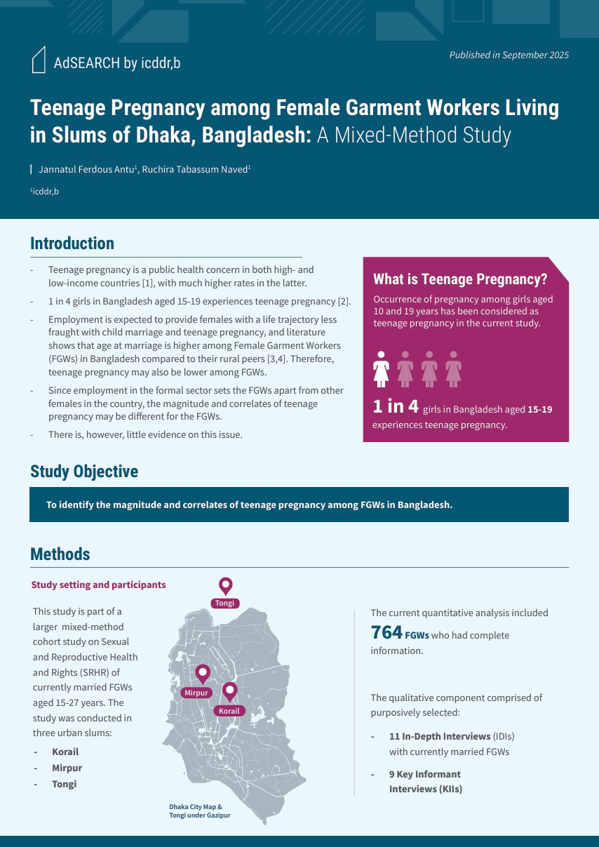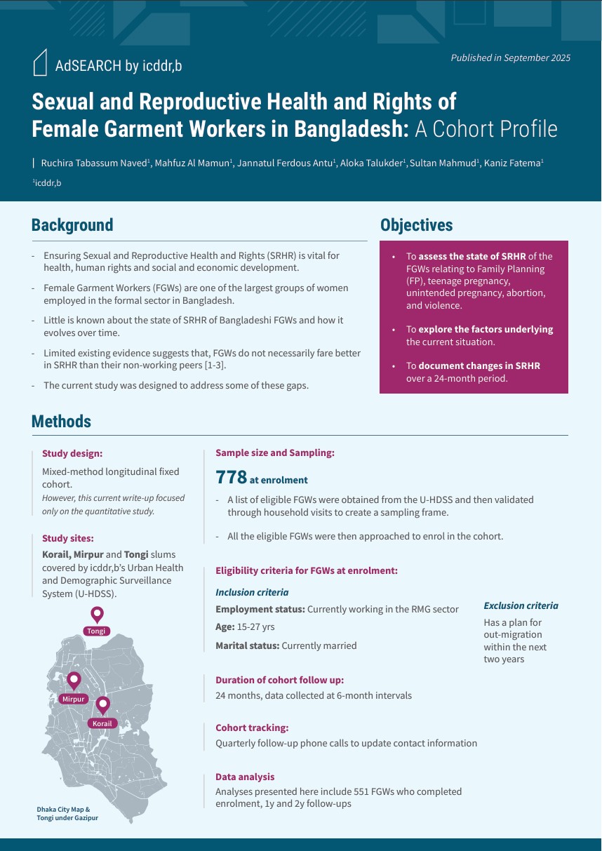 With the objective to assess the current situation in SRHR among FGWs in terms of family planning, first conception, unwanted pregnancy and abortion, STIs/RTIs, and intimate partner and workplace violence, a 30-months long mixed-method longitudinal prospective cohort study is running. We are assessing current SRHR situation, positive and negative changes in SRHR over the study period among the FGWs, and the drivers of the changes. This study is running in three slums (Dhaka North - Korail and Mirpur; and Gazipur - Tongi) at icddr,b’s Urban Health and Demographic Surveillance Site in greater Dhaka among 768 currently married FGWs aged 15-27. A total of 50 In-depth Interviews (IDIs) with unmarried and married FGWs and their husbands and 6 Key Informant Interviews (KIIs) with mother-in-laws/mothers of FGWs, NGO workers, community health workers, etc. are being planned to conduct.