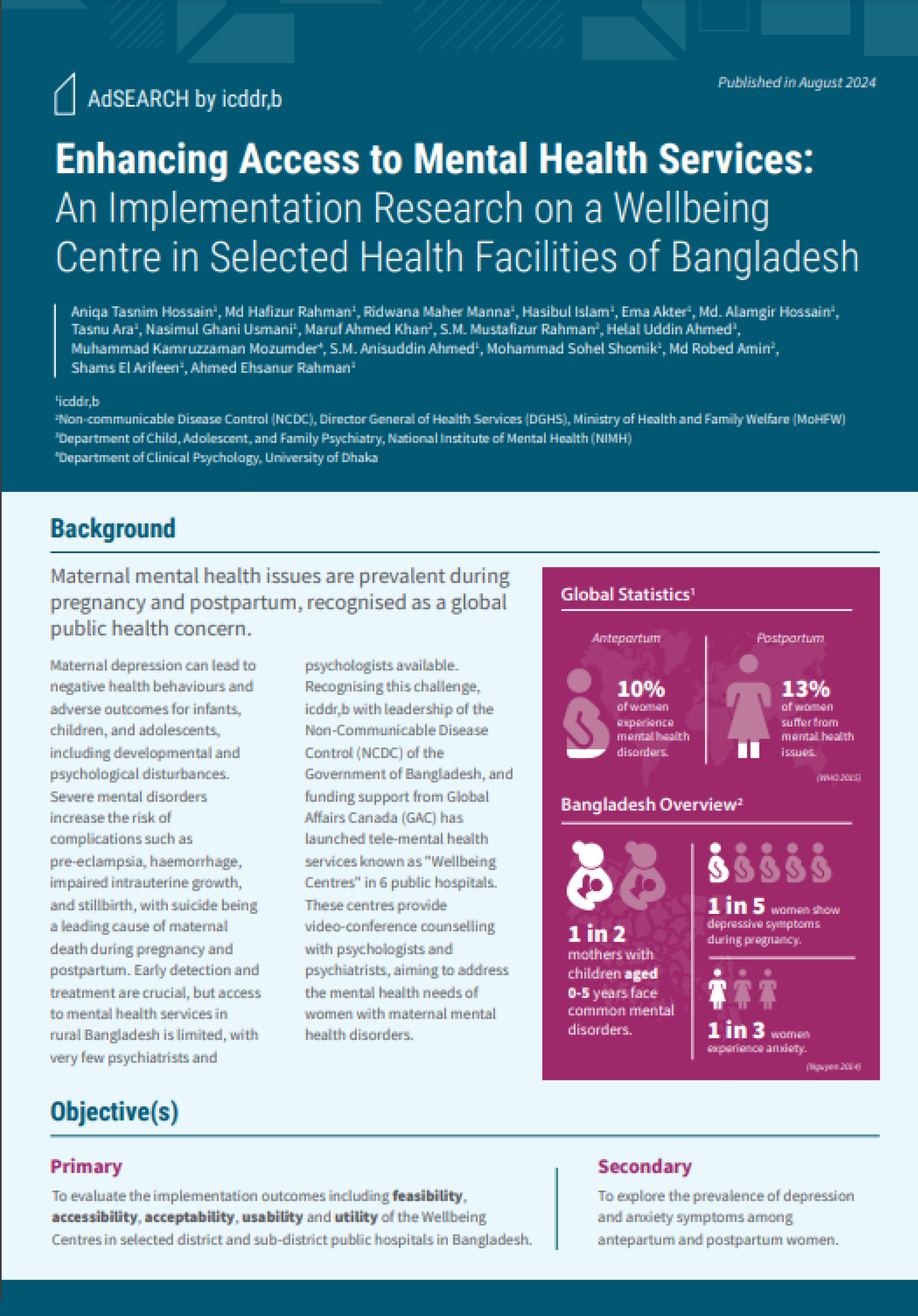 About half of the Bangladeshi mothers have common mental health issues, causing preterm birth, poor mother-child bonding, and even infants' cognitive development. Most of the mental healthcare facilities are clustered around urban area, while rural women do not have access to the mental healthcare in Bangladesh. Moreover, the stigma and misconception regarding mental illness exist and there is a significant scarcity of awareness of mental health in Bangladeshi rural society. Since maternal mental distress among these rural mothers may cause adverse maternal and child health outcome, appropriate interventions are needed to address maternal mental distress among Bangladeshi maternal population. To date, no implementation research has been conducted on improvement of the mental health of mothers during antepartum and postpartum period by minimising access to mental healthcare gaps and enhancing awareness among the mother. Therefore, in this study, we trying to improve the mental wellbeing of mother during antenatal and postnatal period by increasing awareness and access to mental healthcare by establishing a Well-being Corner in primary and secondary level health facilities and assess the implementation aspects of the Well-being Corner.