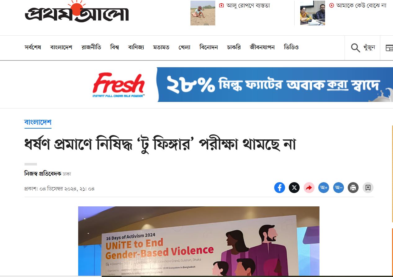 Medio-legal evidence in the court of law is crucial for legal action against sexual perpetrators. Until recently in many South Asian countries, the ‘Two-Finger Test’ (TFT) was used as forensic evidence to determine the occurrence of rape experience by sexual assault victims. TFT is performed by medical practitioners by inserting two fingers into the vagina of a rape survivor to determine if the hymen is broken, as well as to “test the laxity of the vagina”. The test was also used to term rape survivors as “habituated to sex” due to past sexual intercourse to cast doubt on the moral impropriety of the survivor, ignoring the main issue of consent (Hossain 2016). The effectiveness of such physical examinations of rape victims is questionable since such it is usually delayed from a medical standpoint (Huda 2022). Furthermore, forensic medical exam can also add psychological trauma and physical discomfort of the victim. While many countries have reverted these regressive medio-legal practices that humiliate and further traumatize rape victims, until 2018, Bangladesh officially used TFT to provide medio-legal evidence of rape occurrence among sexual assault victims. In 2018, after years of advocacy initiated by SAFE, an icddr,b led project in collaboration with women’s rights groups in Bangladesh, the Supreme Court banned the use of TFT to provide medio-legal evidence for rape cases terming the practice as unscientific, inconclusive, and degrading with no forensic value (BLAST 2018). To date there has been no data on the extent to which this prohibition is being upheld in practice. We intend to address this gap in the knowledge with the goal of supporting improved implementation of this ban.